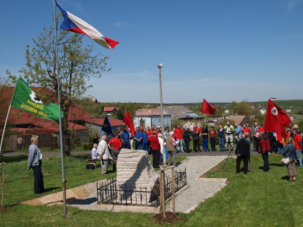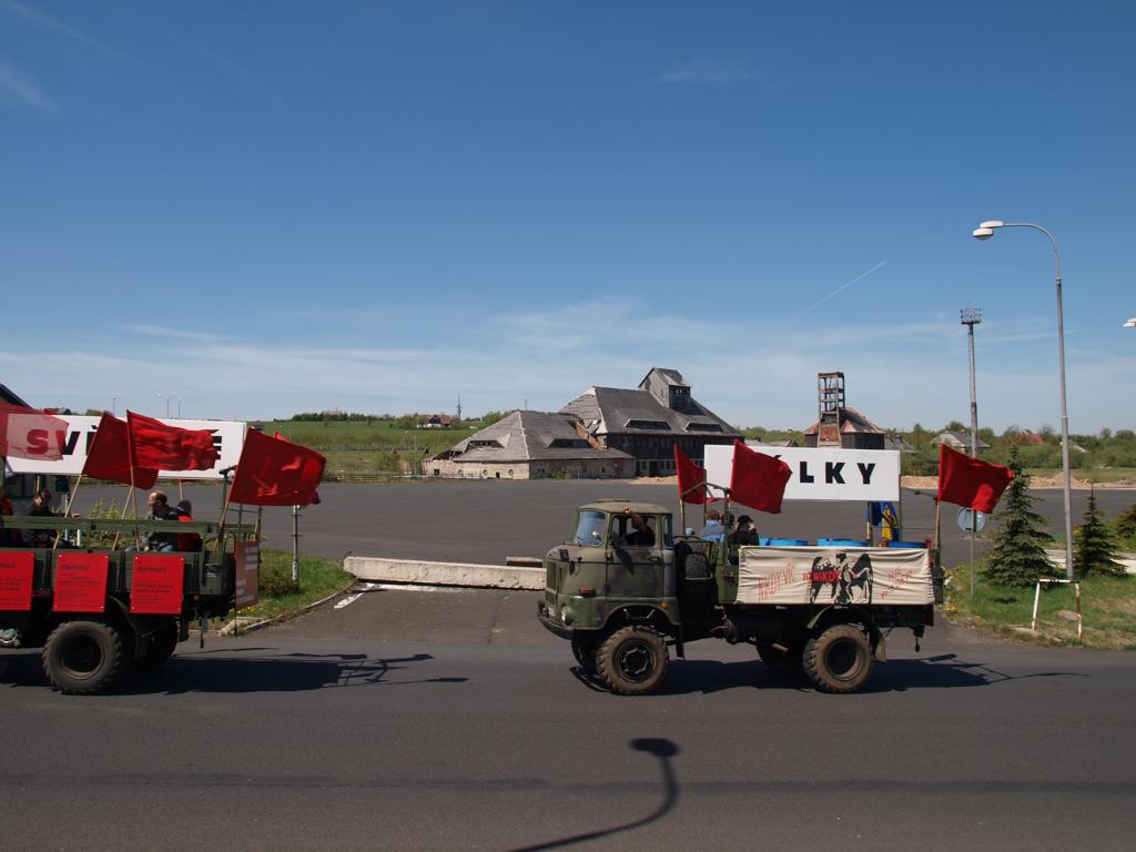 Der Aktionszug „Klassenkampf statt Weltkrieg“ überquert am Mittag des 10. Mai die Grenze zur Tschechischen Republik. Begrüßt wird er von tschechischen und deutschen Antikriegskämpfern. Mit ihnen hält er eine Kundgebung am Denkmal für die tschechoslowakischen Grenzsoldaten, die immer und immer wieder die Souveränität der Tschechoslowakei gegen den deutschen Okkupanten verteidigten. Es sprechen ein Vertreter der Stadt Dubi, Gerd Hommel vom Revolutionären Freundschaftsbund, Unterstützer von „Klassenkampf statt Weltkrieg“. Oberst a.D. Kathert berichtet von der Klassen- und Waffenbrüderschaft zwischen DDR- und tschechoslowakischen Grenzsoldaten, die begründet wurde, als die souveräne DDR noch bestand und keine Bundeswehr, sondern eine Arbeiter- und Bauernarmee an dieser Grenze stand. Die Völker Osteuropas schliefen sicherer damals.
