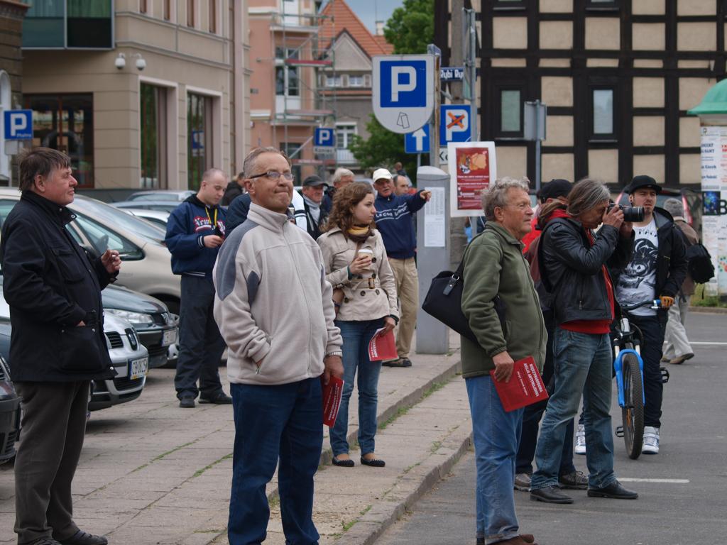 In Frankfurt/Oder hält der Zug in der Bischofsstraße seine Kundgebung ab. Anna Busl (SJD – Die Falken) erinnert daran, dass es die DDR war, die die "Brücke der Freundschaft" zwischen Frankfurt/Oder und Slubice wieder aufbaute. Der Staat, der bedingungslos die Oder-Neiße-Friedensgrenze anerkannte. Heute rückt über die Brücke der Staat der deutschen Monopole, der diese Grenze nie anerkannt hat. Heinz Klee, Kommunist aus Frankfurt/Main ("Besser war es und der Frieden sicherer, als die beiden Frankfurt noch in zwei Ländern lagen."): Die Faust in der Tasche zu ballen, nützt nichts. Dieser Zug ist auch ein Symbol für das, was not tut – die Organisierung der Kämpfer gegen Krieg und Ausbeutung. Oder: "Heute seht ihr auf diesem Zug die Attrappe einer V2. Wenn wir den Kampf gegen den Krieg nicht organisiert und einig führen, einig auch mit den Völkern anderer Länder, dann wird diese Rakete in anderer Form zurückkommen und ihr Vernichtungswerk tun, das der deutsche Imperialismus zweimal um des Maximalprofits und des Raubes willen bis zu einem Weltkrieg getrieben hat. Auch das erleben wir: Ein junger Mann weigert sich, ein Flugblatt zu nehmen. "Ohne Krieg wäre ich arbeitslos." Auch so, in den verzweifelten Köpfen von Proleten, werden Kriege vorbereitet und gemacht.